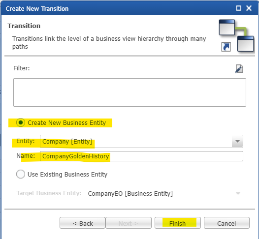 4. Select Create New Business Entity, the entity required, add a name and click on Finish